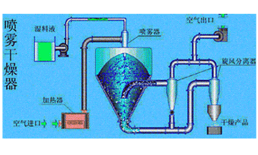 噴霧幹燥是利用霧化器將料液分散為細小的霧滴,並在熱幹燥介質匯總迅速蒸發溶劑形成幹粉的過程,一般噴霧幹燥分為四個階段:料液霧化;霧群與熱幹燥介質接觸混合;霧滴的蒸發幹燥;幹燥產品與幹燥介質分離。